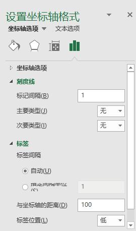 步骤2:单击选择“垂直轴”,即纵坐标轴上的数据,单击鼠标右键打开【设置坐标轴格式】对话框,首先切换到【填充与线条】对话框,将【线条】修改为【无线条】,再切换到【坐标轴选项】对话框,修改【最小值】为“-300”,【最大值】为“300”,【主要】刻度单位为“100”,关闭【设置坐标轴格式】。