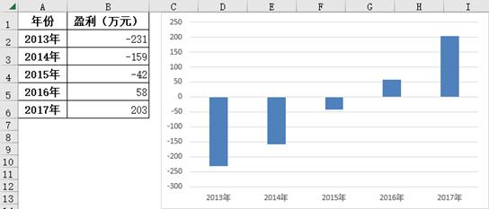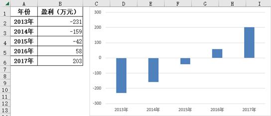 步骤3:美化图表。将非盈利的数据系列(2013年、2014年和2015年)调整为绿色,盈利的数据系列(2016年和2017年)调整为红色。选中“绘图区”,将鼠标指针移动到绘图区的上边框,当鼠标指针变成双箭头时向下拖,为图表标题留出位置,再将鼠标指针移动到绘图区的下边框,向上拖,为图表脚注留出位置,然后采用插入“横排文本框”的方法创建标题和脚注,通过调整字号大小、行间距、填充色等对图表进行进一步的美化调整,完成图表制作。