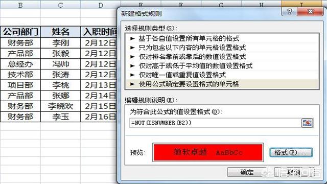 第二步,此时将打开“新建格式规则”对话框,在对话框的“选择规则类型”列表中选择“使用公式确定要设置格式的单元格”选项,在“为符合此公式的值设置格式”文本框中输入公式”=NOT(ISNUMBER(B2))”,单击“格式”按钮打开“设置单元格格式”对话框,在“填充”选项卡中设置单元格的填充颜色。