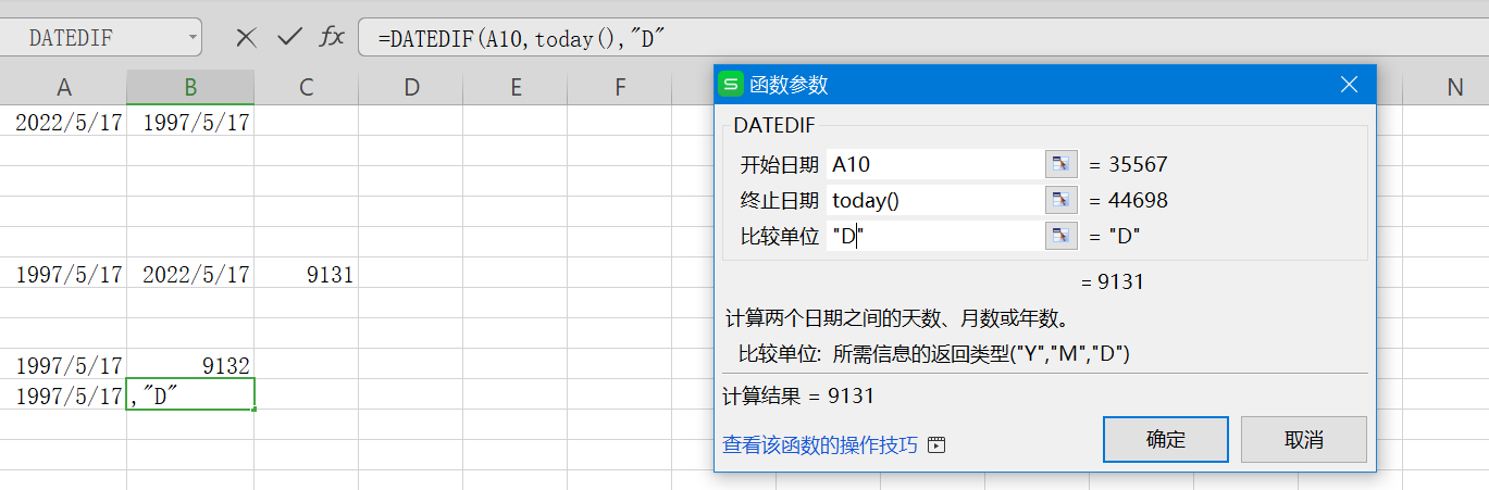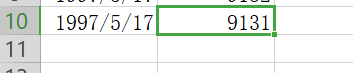 方法一,直接输入今天的日期,然后用该单元格减去之前日期所在单元格。下面例子中就是需要计算1997年5月17日到今天的天数,输入今天日期2022年5月17日之后,两个单元格相减得到两个日期相隔9131天。