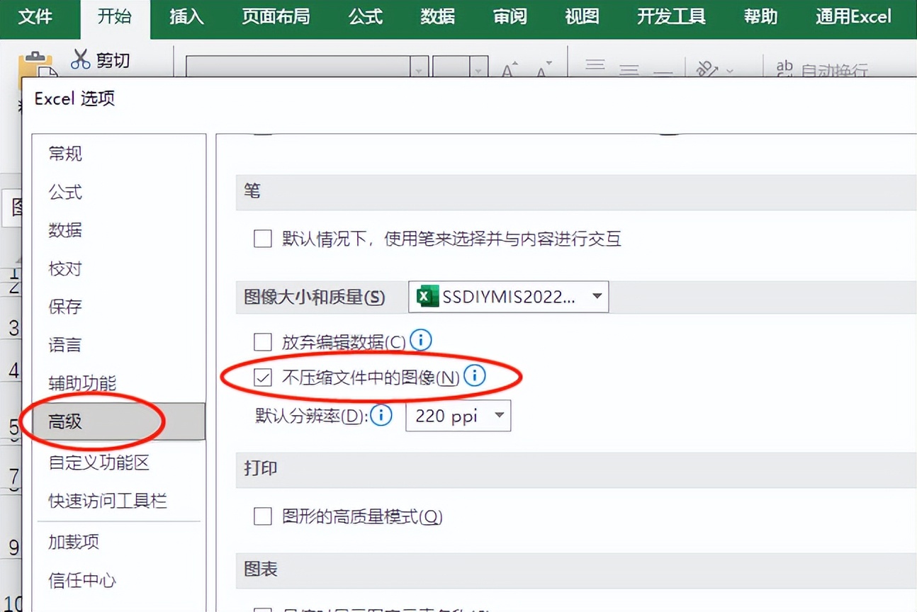 2、设置Excel的属性,步骤:文件→选项→高级→图像大小和质量→勾选【不压缩文件中的图像】,确定并重新打开Excel即可。