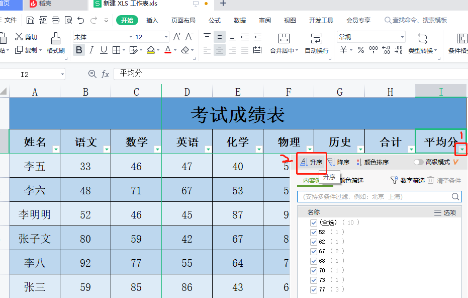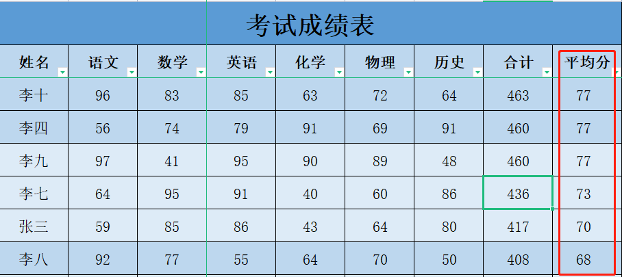 这时工作表的所有数据也将根据“平均分“由高到低进行排序。