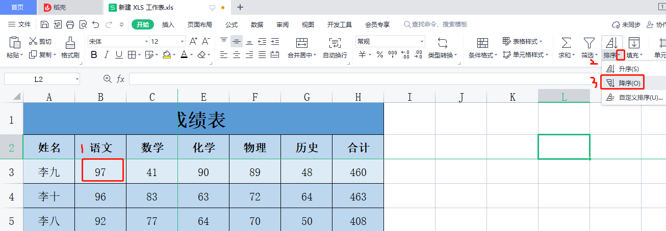 这时工作表中的所有数据将根据“语文”列表中的数据从高到低进行顺序排列。