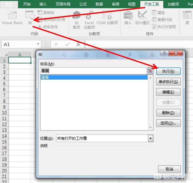 按快捷键F5可直接执行代码;或关闭VBA编辑器后,在工作表界面依次点击【开发工具】选项卡——【宏】——选中相应的宏【星星】——点击【执行】。
