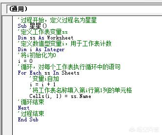 Sub 星星()Dim ss As WorksheetDim i As Integeri = 0For Each ss In Sheets i = i + 1 Cells(i, 1) = ss.NameNextEnd Sub