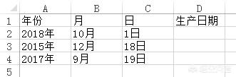 如下图:要把A列(年份)、B列(月)、C列(日)的数据合并在一起显示在D列(生产日期) 。
