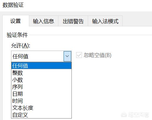 步骤3:在“有效性”窗口中选择,在“设置”选项卡中,在“允许”的下拉菜单中选择“自定义”。