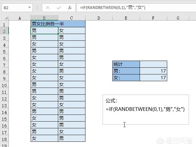 RANDBETWEEN(0,1)可以随机产生0和1,因此用“=IF(RANDBETWEEN(0,1),”男”,”女”)公式就可以实现男女比例各一半。