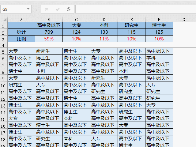 最终按比例填充文本的公式就是“ =CHOOSE(MATCH(RAND(),{0,0.6,0.7,0.8,0.9}),”高中及以下”,”大专”,”本科”,”研究生”,”博士生”)”。