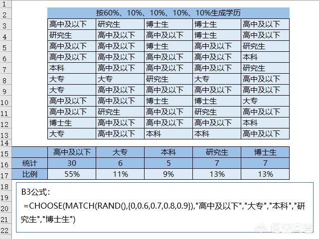 “ =CHOOSE(MATCH(RAND(),{0,0.6,0.7,0.8,0.9}),”高中及以下”,”大专”,”本科”,”研究生”,”博士生”)”。