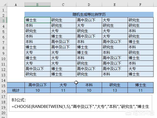 公式为:“=CHOOSE(RANDBETWEEN(1,5),”高中及以下”,”大专”,”本科”,”研究生”,”博士生”)”。