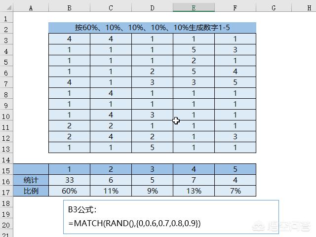 公式为:“=MATCH(RAND(),{0,0.6,0.7,0.8,0.9})”。MATCH函数返回的是单元格的位置,因为只有5个概率,所以返回数字1-5。