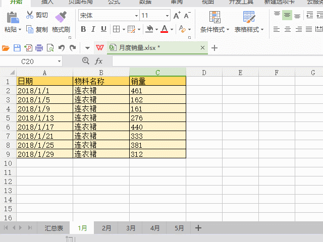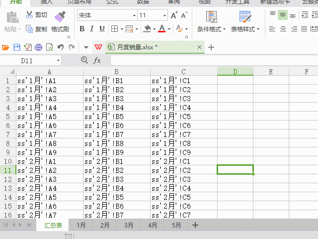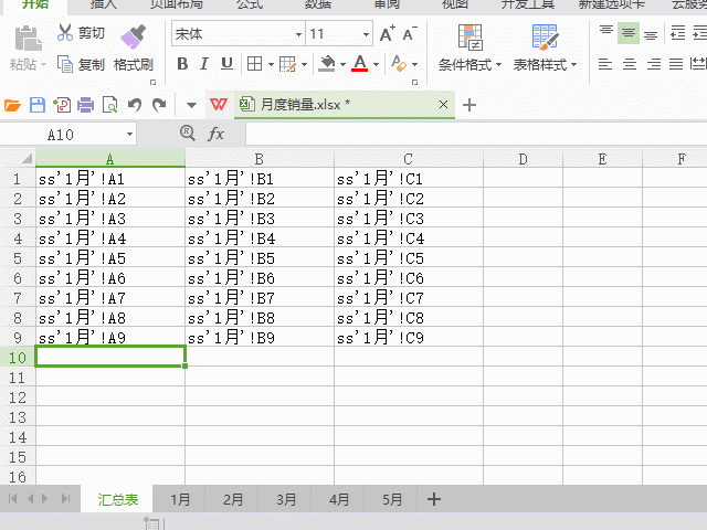 步骤1:新建一个空白工作表,在第一个单元格输入“=1月工作表单元格A1”,然后向右拖动获取1月工作表中第一行的数据,接着将公式中的“=”号修改成“ss”,然后向下填充到第9行(1月工作表有9行数据)。