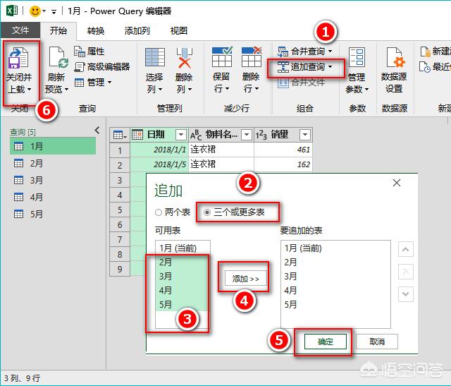 步骤3:设置追加查询,添加所有的工作表(可用Shift键快速选择),然后点击“关闭并上载”。