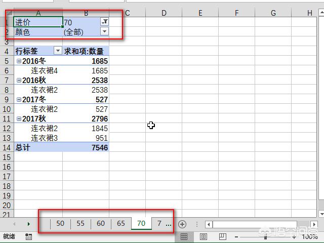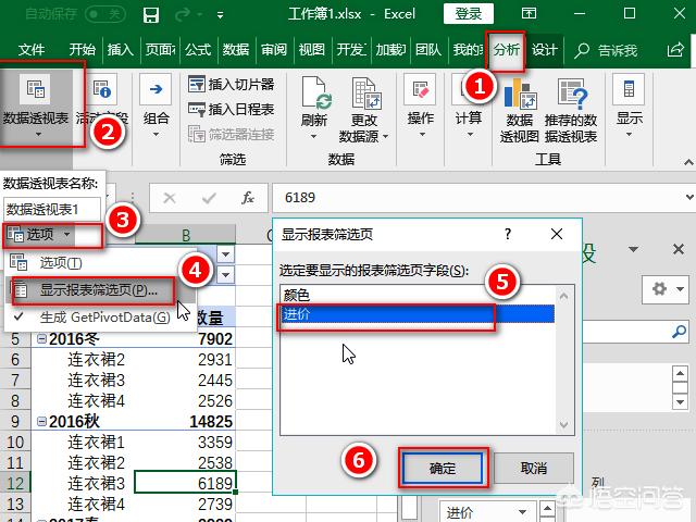 点击“分析”——“数据透视表”——“选项”——“显示报表筛选页”,选择“进价”,这样就将一张大表拆分成了多个进价的子表。