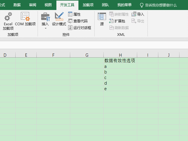 - 下拉菜单选项为$H$2:$H$6, 也可以直接输入选项,如Formula1:=”a,b,c,d,e” ,默认值可以包含在选项中,也可以不包含在选项中。
