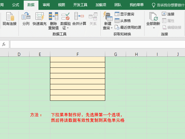 如图,先设置好下拉菜单,接着选择好第一个选项,然后向下填充复制数据有效性,这样,其他所有的下拉框默认都会显示第一个值啦。