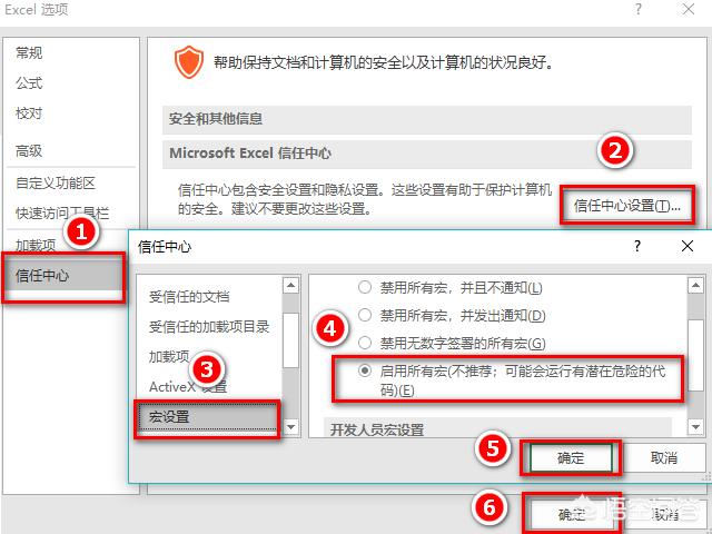 1. 使用方法2,必须在Excel选项中打开“启用所有宏”选项。