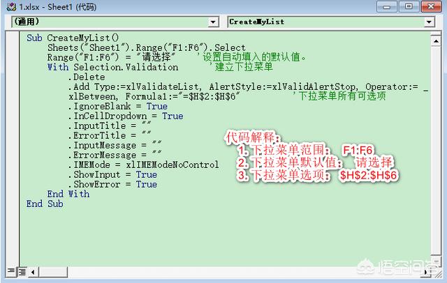 - 下拉菜单默认值为“ 请选择”,也可以引用单元格的值如, Range(“F1:F6”) = “=$H$2″。