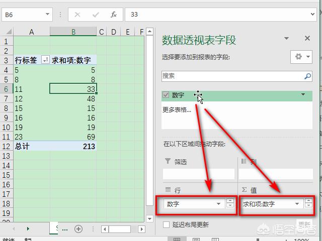 步骤2:将“数字”字段拖到“行”和“值”下。