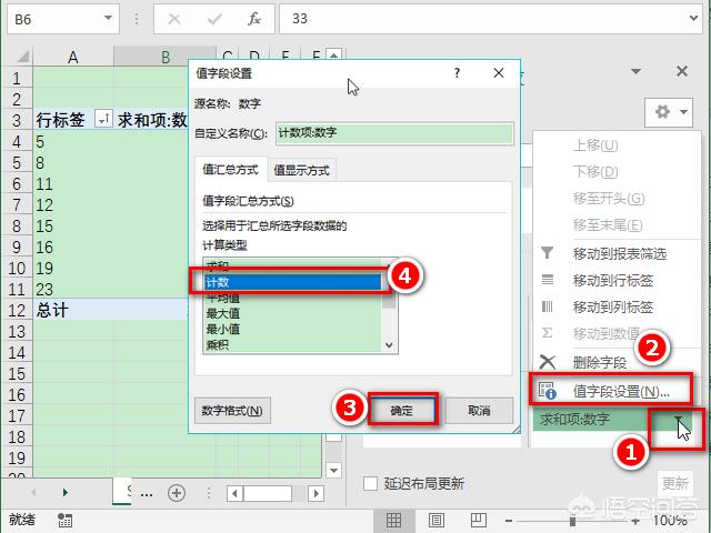步骤3:点击值字段右侧的向下小箭头,选择“值字段设置”,修改汇总方式为“计数”。