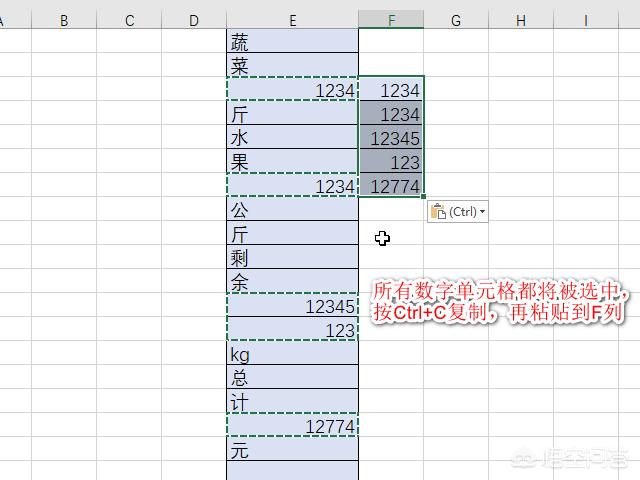 4. 现在所有的数字都处于选中状态,按住Ctrl + C复制这些单元格,再粘贴到F列,就成功提取出了所有的数字啦。