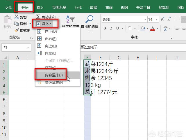 1. 将单元格的列宽调整到一个字的宽度,选中所有单元格,点击“开始”——“填充”——“内容重排”(也有些Excel版本是“两端对齐”)。