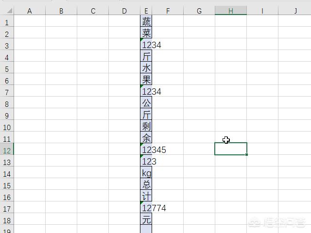 2. 接着就可以得到如下的表格。可以看到其中的数字都在独立的单元格中,前面显示了一个绿色的小三角,这表示这些数字现在是“文本”格式的。选中所有单元格,点击“数据”——“分列”——保持默认设置——“完成”。