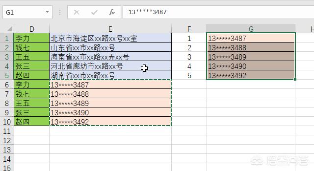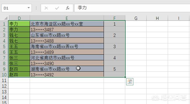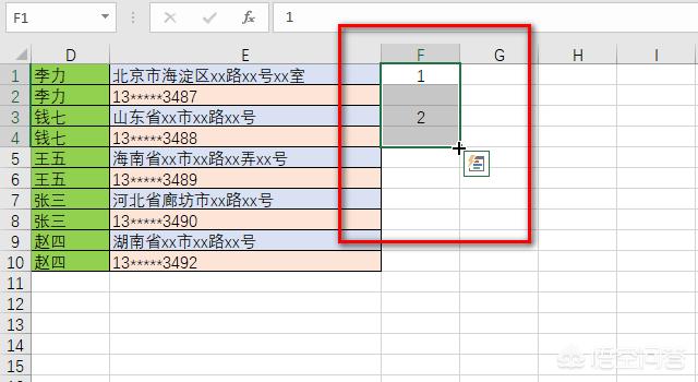 3. 条件格式标记出了所有有地址和电话的人。点击筛选按钮,选择按照颜色筛选,将这些有颜色的行全部复制出来。在F1和F3输入1和2,选中前面四个单元格,如图。