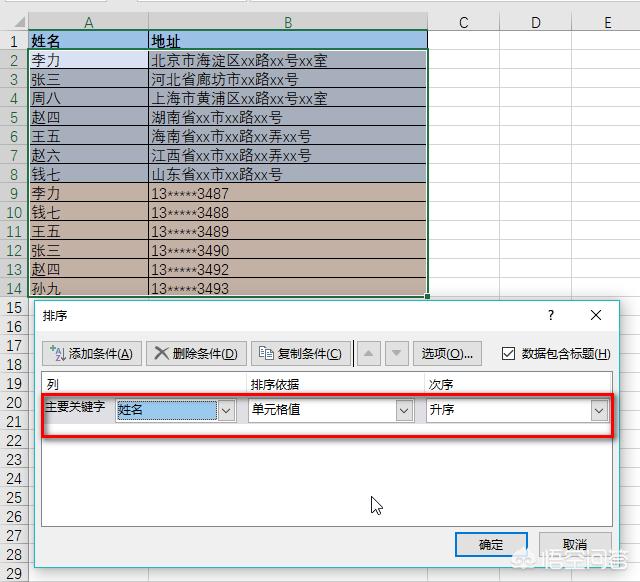 首先不论是哪种方法,“姓名”是两张表共同的关键词,请先分别给两个表格按照“姓名”进行“升序”排列。