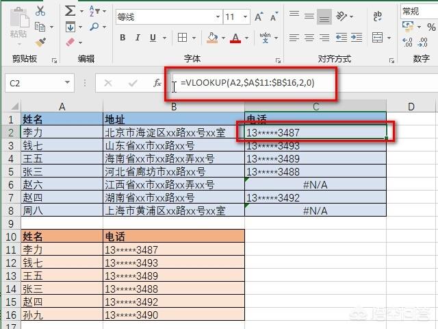第二个参数($A$11:$B$16):表示查找的范围。我们要在第二张表格中先找到“李力”,然后再找到他的电话。因此,这个参数就是第二张表中所有包含姓名和电话的单元格。