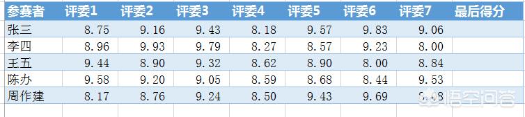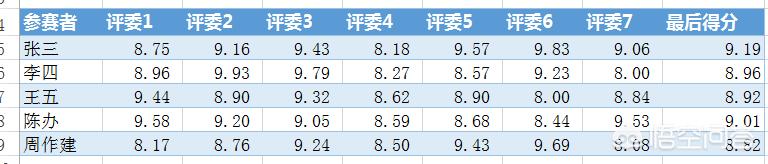 如何下图所示,我们该如何利用Excel快速地求得各个参赛选手的最后得分(即去掉一个最高分和最低分,剩余的分数求平均分)?如何对最后写成绩进行排名?