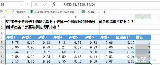 例如本例中要求出参赛选手的最后得分,我们可以使用如下公式: