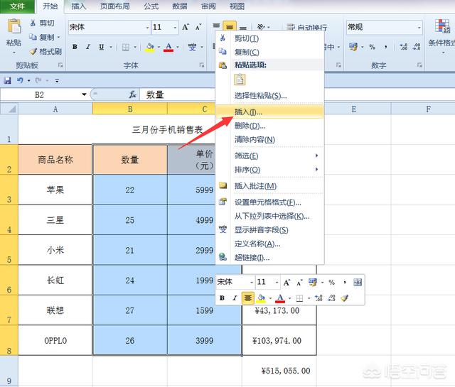 选中要插入的单元格样式以及数量,单击右键点击插入,如图所示: