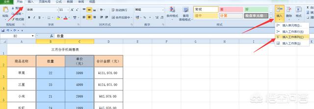 同样的,选中要插入的单元格样式以及数量,在开始菜单中点击插入并选择插入工作列,这种方法的快速插入N列就完成啦!如图所示: