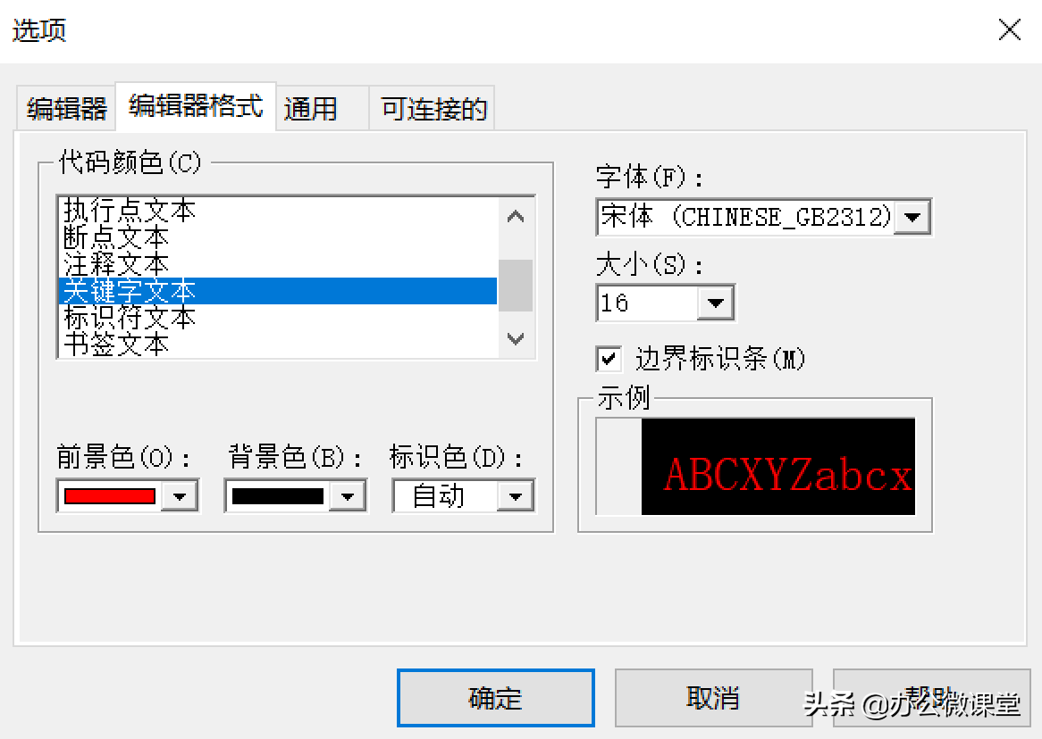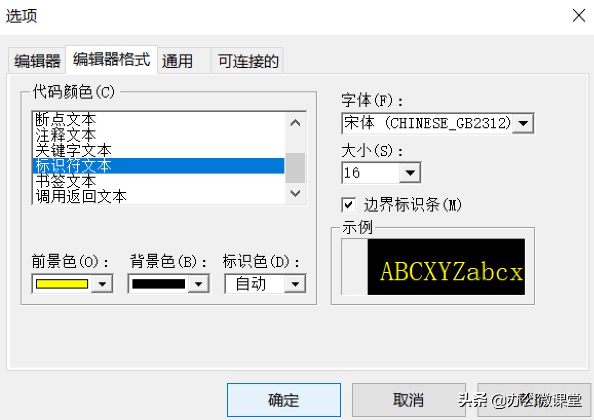 (如上图)标识符文本:前景色(黄色)、背景色(黑色)、标识色(自动);字体(宋体)、大小(16)