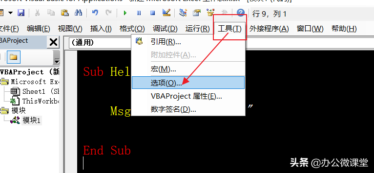 在VBA编辑器的工具栏中找到【工具】点击,在弹出的菜单选项中,选择【选项】