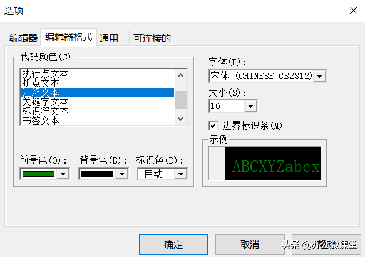 (如上图)注释文本:前景色(绿色)、背景色(黑色)、标识色(自动);字体(宋体)、大小(16)