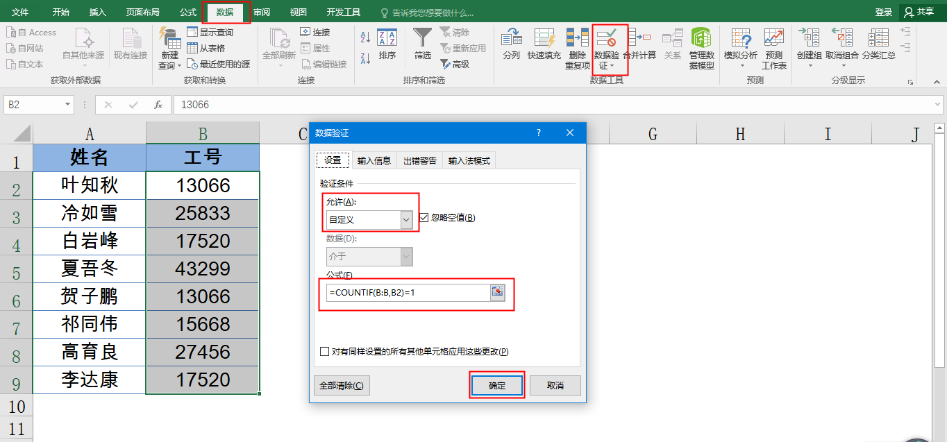 选中B2:B9单元格区域,一次执行【数据】→【数据验证】命令打开【数据验证】对话框。设置数据验证的【允许】规则为【自定义】,在公式编辑框中输入以下公式=COUNTIF(B:B,B2)=1,限制B列输入内容不能有重复项。