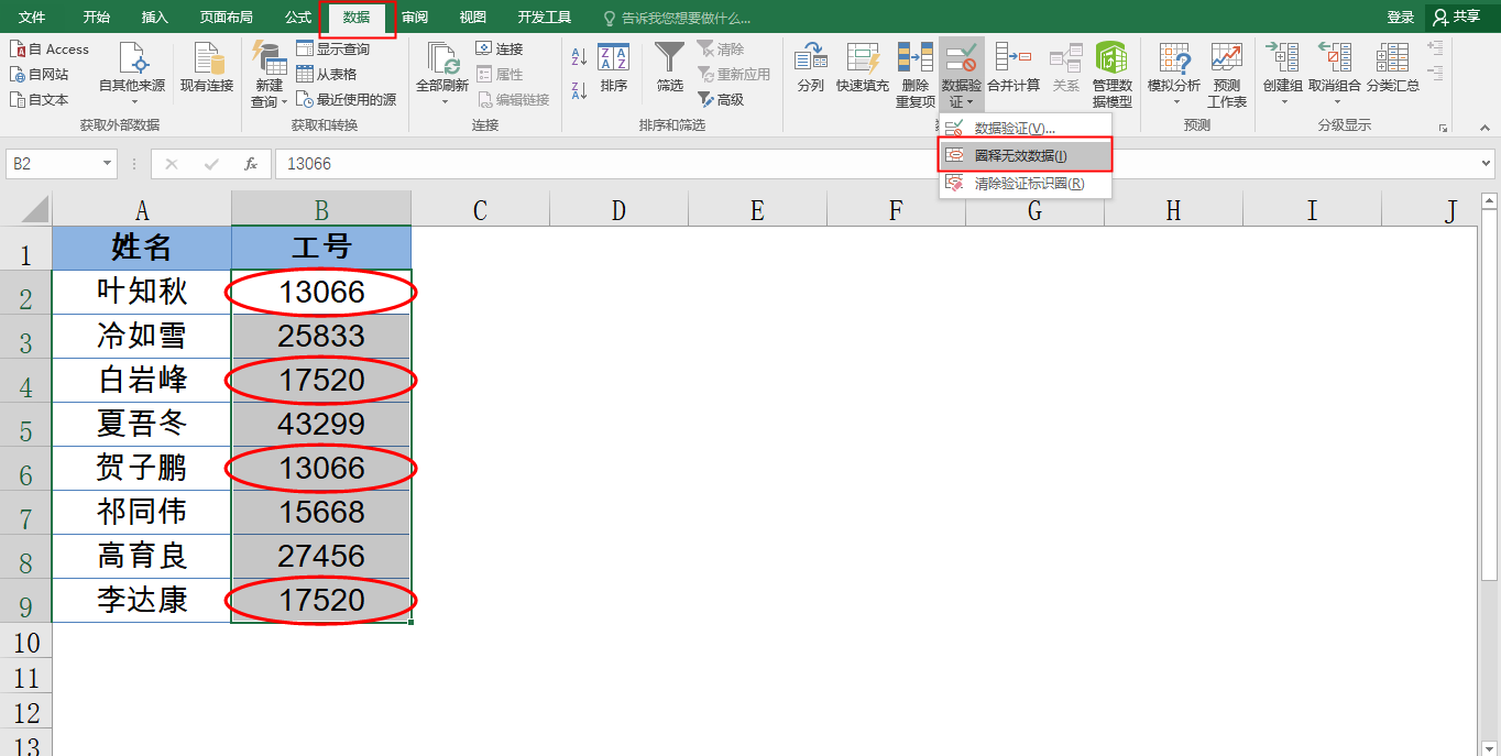 依次选择【数据】→【数据验证】→【圈释无效数据】选项,如下图