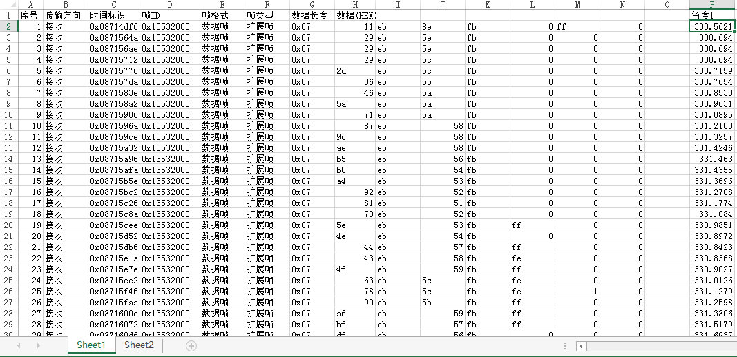 这里说明一下,如果接收到的数据帧ID有很多种,需要先使用“排序和筛选”功能,只显示需要分析的帧ID。示例的数据帧ID为0x13532000,每帧的数据长度为7个字节,其中第0个、第1个字节为角度1,第2个、第3个字节为角度2。角度的单位为度,范围为0~360°,比例系数为360/65536。