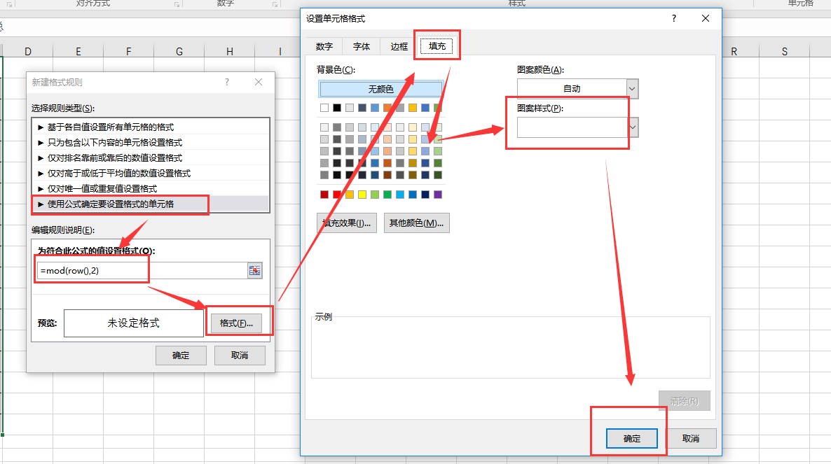 弹出“新建格式规则”对话框,在“选择规则类型”列表中单击“使用公式确定要设置格式的单元格”选项 ,输入公式=mod(row(),2) ,单击“格式”按钮 弹出“设置单元格格式”对话框,在“填充”选项卡下选择背景色。