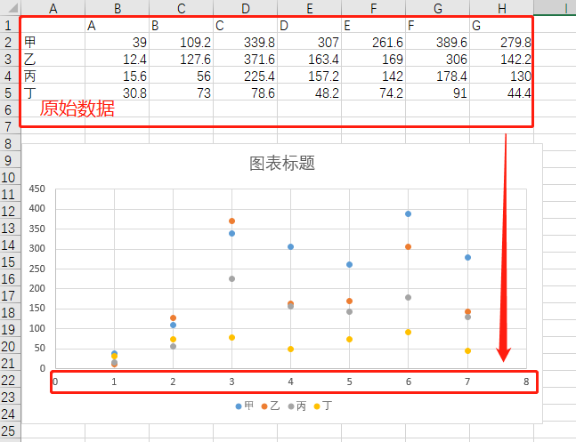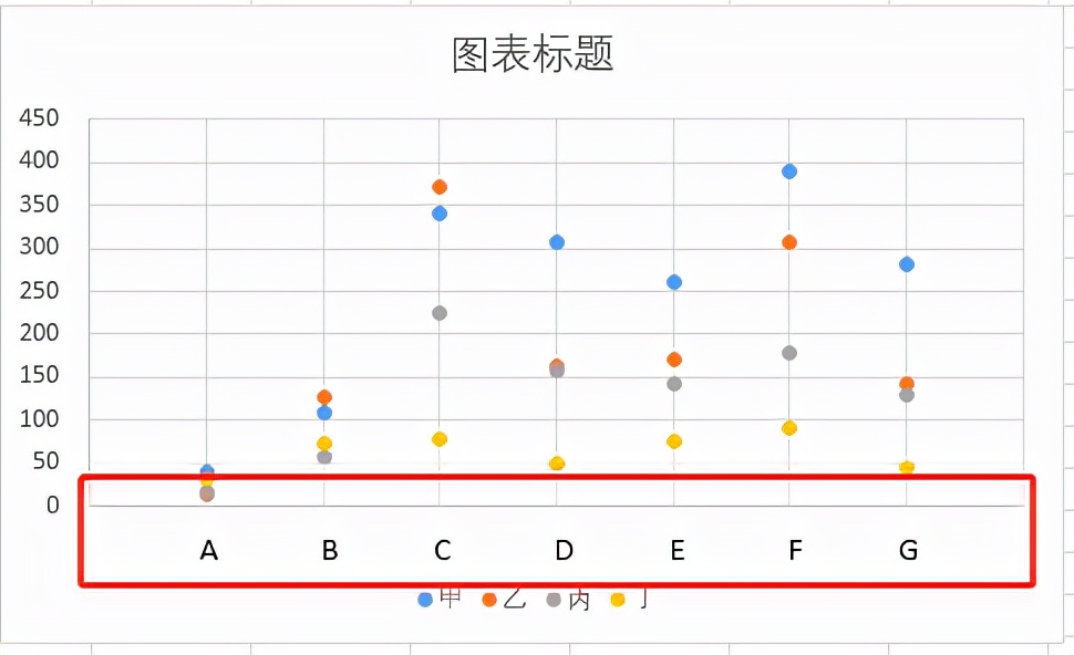 有时候我们需要横坐标展示文字内容, 怎么更改呢,今天教大家通过添加文本框,将散点图的横坐标设置为文字内容,五步即可搞定: