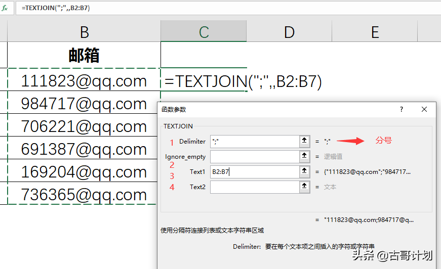 解题思路: 公司内部的通讯录有邮件地址,但是是分开不同单元格的,群发邮件是用 “;”来区分的,所以我们可以利用新函数来实现