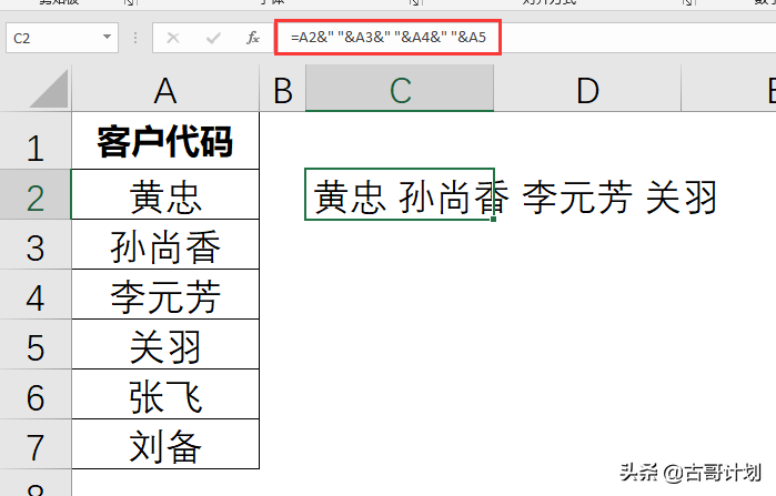 看到这个问题,第一反应肯定是用连续符号 “&”,这里还好单元格不多,可以慢慢连接,如下图: