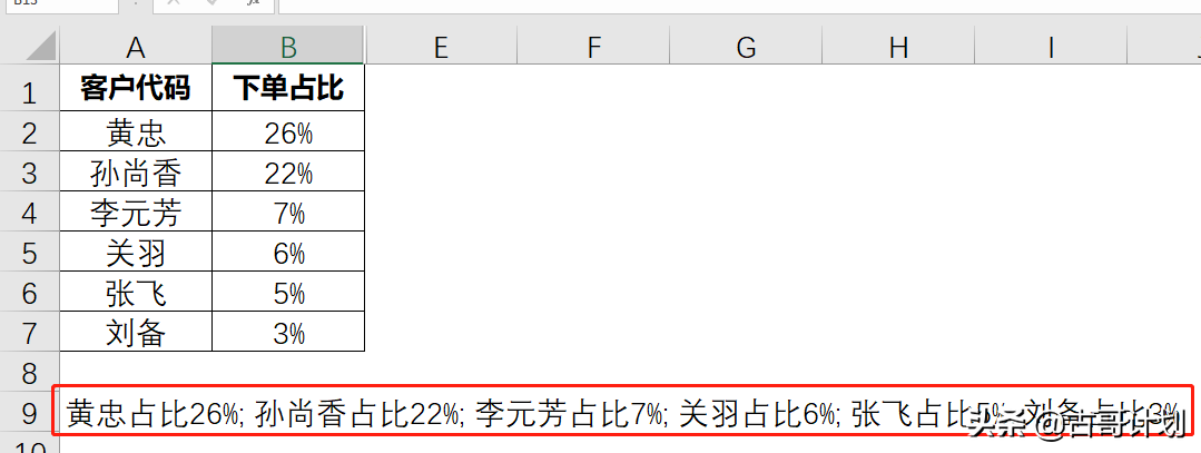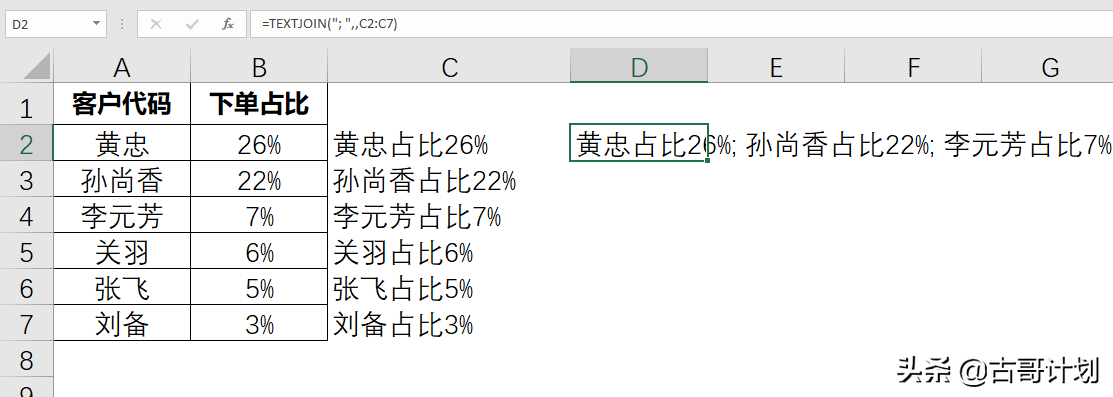 C2输入公式 =TEXTJOIN(“占比”,,A2:B2) 下拉 ,这里注意 文本”占比”当成第1个参数了;