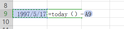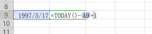 方法二、用“today”函数,输入“=today()-A9”,同样得到9131。另外,如果在函数里面“+1”,表示将当前日期当天也计算在内。