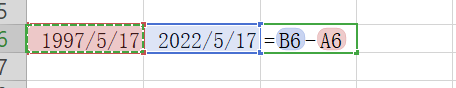 方法一、直接输入今天的日期,然后用该单元格减去之前日期所在单元格。下面例子中就是需要计算1997年5月17日到今天的天数,输入今天日期2022年5月17日之后,两个单元格相减得到两个日期相隔9131天。