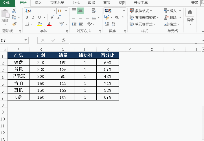 首先,需要先修改数据源表格,增加两列辅助列,即下图中的“辅助列”和“百分比”列。