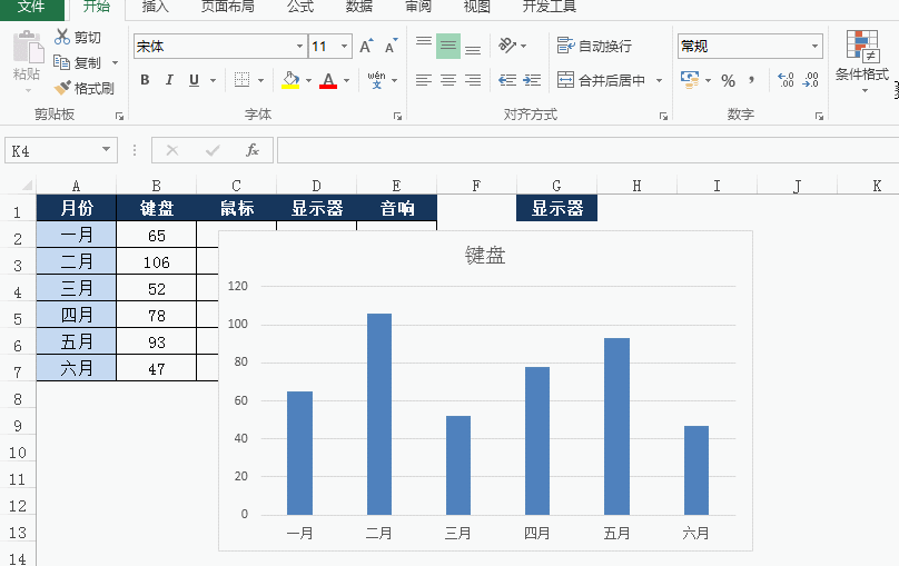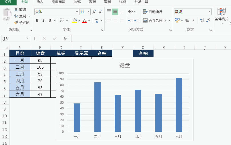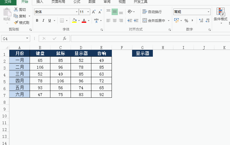 在单元格G1中,创建一个下拉菜单,内容包括“键盘”,“鼠标”,“显示器”和“音响”等选择内容